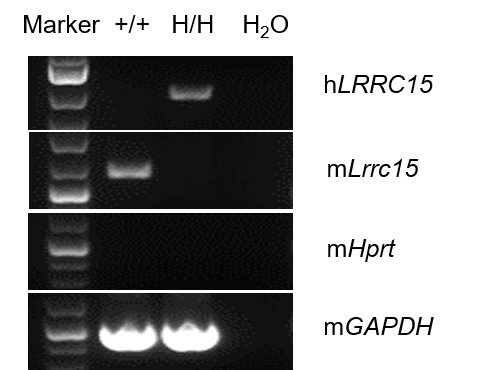 Strain specific analysis of LRRC15 gene expression in wild-type C57BL/6 mice and B-hLRRC15 mice by RT-PCR. Mouse Lrrc15 mRNA was detectable only in brain of wild-type C57BL/6 mice (+/+). Human LRRC15 mRNA was detectable only in homozygous B-hLRRC15 mice (H/H), but not in wild-type mice.
