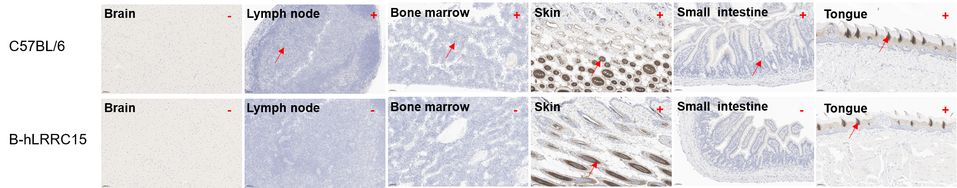 Immunohistochemical (IHC) analysis of LRRC15 expression in B-hLRRC15 mice. The brain, lymph node, bone marrow, skin, small intestine and tongue were collected from wild-type C57BL/6JNifdc mice and B-hLRRC15 mice (female, 6-7-week-old), analyzed by IHC with anti-LRRC15 (CST, #50546S). LRRC15 was detectable in these two strains owing to antibody cross-reactivity between human and mouse. LRRC15 was detectable in skin and tongue of B-hLRRC15 mice, but not in brain, lymph node, bone marrow and small intestine. The arrow indicates tissue cells with positive LRRC15 staining (brown). “+” indicates that the tissue is positive, and “-” indicates that the tissue is negative.