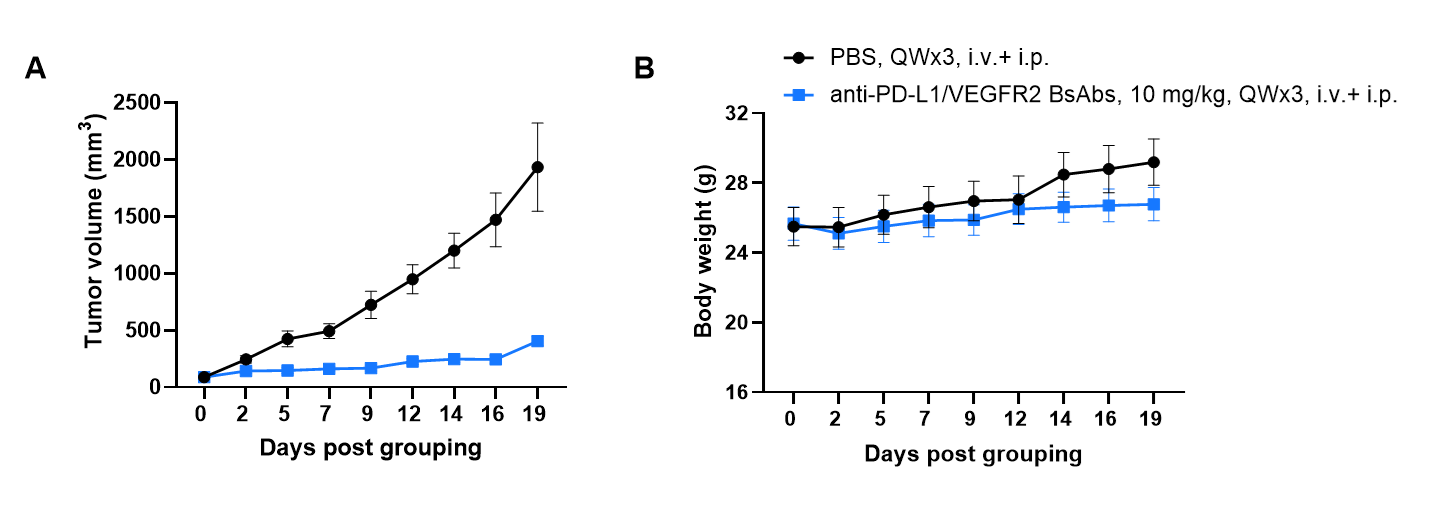 Antitumor activity of anti-PD-L1/VEGFR2 BsAbs in B-hPD-1/hPD-L1/hVEGFR2 mice. Murine colon cancer B-hVEGFA/hPD-L1 plus MC38 were subcutaneously implanted into homozygous B-hPD-1/hPD-L1/hVEGFR2 mice (male, 7-week-old, n=6). Mice were grouped when tumor volume reached approximately 80-120 mm3, at which time they were intraperitoneally injected with anti-PD-L1/VEGFR2 bispecific antibody indicated in panel. As shown in panel A, anti-PD-L1/VEGFR2 BsAbs was efficacious in controlling tumor growth in B-hPD-1/hPD-L1/hVEGFR2 mice. The antibody provided by the client. Values are expressed as mean ± SEM.