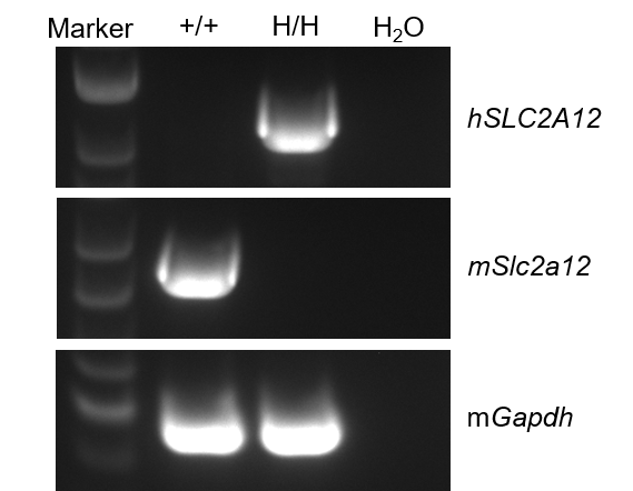 Strain specific analysis of SLC2A12 mRNA expression in wild-type C57BL/6JNifdc mice and B-hSLC2A12 mice by RT-PCR. Kidney RNA were isolated from wild-type C57BL/6JNifdc mice (+/+) and homozygous B-hSLC2A12 mice (H/H), then cDNA libraries were synthesized by reverse transcription, followed by PCR with mouse or human SLC2A12 primers. Mouse Slc2a12 mRNA was only detectable in wild-type mice. Human SLC2A12 mRNA was exclusively detectable in homozygous B-hSLC2A12 mice but not in wild-type mice.
