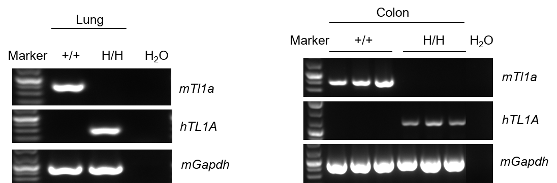 Strain specific analysis of TL1A gene expression in wild-type (WT) mice and B-hTL1A mice by RT-PCR. Mouse Tl1a mRNA was detectable only in lung and colon of wild-type C57BL/6 mice (+/+). Human TL1A mRNA was detectable only in homozygous B-hTL1A mice (H/H) but not in wild-type C57BL/6 mice (+/+) .