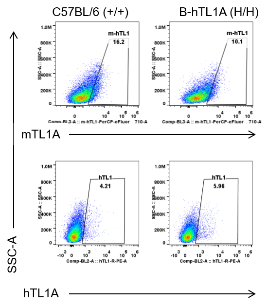 Strain specific TL1A expression analysis in wild-type C57BL/6 mice and homozygous humanized B-hTL1A mice by flow cytometry. Lung endothelial cells were collected from wild-type C57BL/6 mice (+/+) and homozygous B-hTL1A mice (H/H). Protein expression was analyzed with anti-TL1A antibody by flow cytometry. TL1A was detectable in wild-type C57BL/6 mice and homozygous B-hTL1A mice due to the cross-reactivity of antibodies.