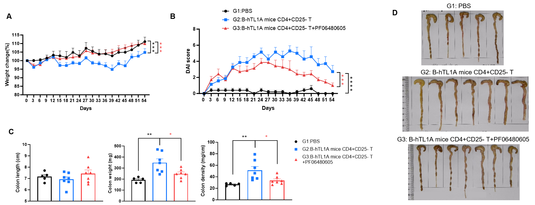 CD4+CD25- T cells were isolated from the spleens of B-hTL1A mice using commercial kits. B-Rag2 KO animals in groups G2-G3 were injected with 6×105 CD4+CD25- T cells, while B-Rag2 KO animals in group G1 were injected with the same volume of PBS. Animals in group G3 were given 25 mg/kg of anti-TL1A antibody PF06480605 twice a week. (A) Body weight change. (B) DAI score. (C) Colon index. (D) Colon photo. Administration of anti-TL1A antibody PF06480605 effectively improved T cells-induced colitis, Two-way ANOVA or one-way ANOVA was used for multiple comparisons, with each group compared to group G2. Values are expressed as mean ± SEM. *p<0.05, **p<0.01, ***p<0.001, ****p<0.0001.