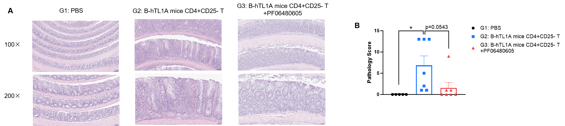 CD4+CD25- T cells were isolated from the spleens of B-hTL1A mice using commercial kits. B-Rag2 KO animals in groups G2-G3 were injected with 6×105 CD4+CD25- T cells, while B-Rag2 KO animals in group G1 were injected with the same volume of PBS. Animals in group G3 were given 25 mg/kg of anti-TL1A antibody PF06480605 twice a week. (A) H&E staining of colon tissue. (B) Pathological score. Administration of anti-TL1A antibody PF06480605 improved T cells-induced colitis, Two-way ANOVA or one-way ANOVA was used for multiple comparisons, with each group compared to group G2. Values are expressed as mean ± SEM. *p<0.05, **p<0.01, ***p<0.001, ****p<0.0001.