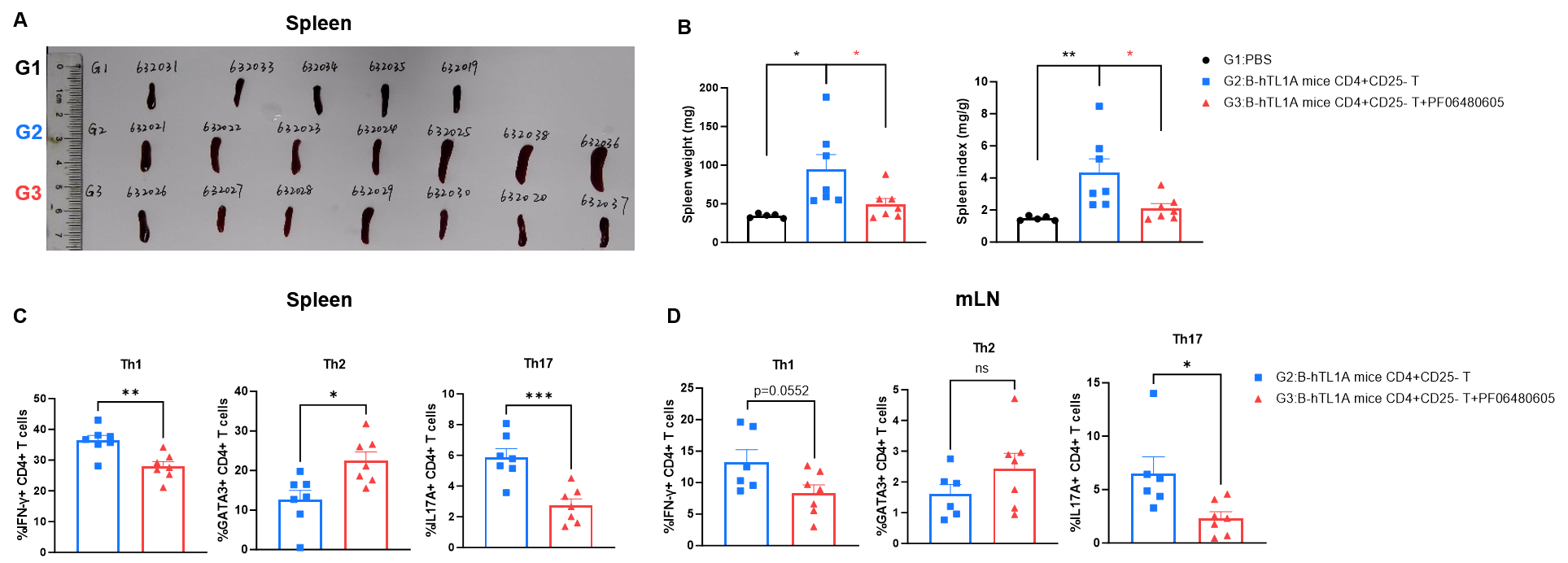 CD4+CD25- T cells were isolated from the spleens of B-hTL1A mice using commercial kits. B-Rag2 KO animals in groups G2-G3 were injected with 6×105 CD4+CD25- T cells, while B-Rag2 KO animals in group G1 were injected with the same volume of PBS. Animals in group G3 were given 25 mg/kg of anti-TL1A antibody PF06480605 twice a week. (A) Spleen photo. (B) Spleen index. (C) Percentages of Th1, Th2 and Th17 cells in spleen. (D) Percentages of Th1, Th2 and Th17 cells in mLNs. Administration of anti-TL1A antibody PF06480605 effectively improved T cells-induced colitis, Two-way ANOVA or one-way ANOVA was used for multiple comparisons, with each group compared to group G2. Values are expressed as mean ± SEM. *p<0.05, **p<0.01, ***p<0.001, ****p<0.0001.