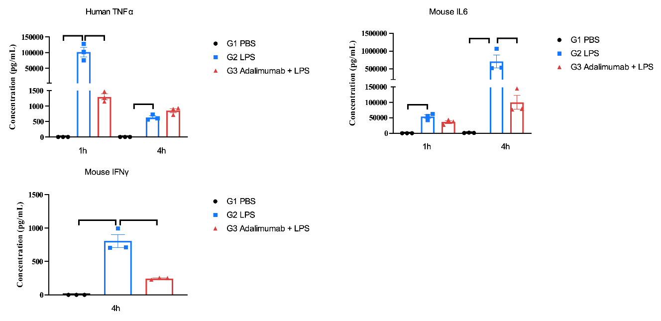 Human TNFA, mouse IL6, and mouse IFNγ expression analysis in homozygous humanized B-hTNFA/hTNFR2/hTNFR1 mice by ELISA. Mice received LPS injection (i.p.) two hours following PBS or Adalimumab (i.v., in house) treatment. Serum was collected from homozygous B-hTNFA/hTNFR2/hTNFR1 mice one hour and four hours after LPS injection. Expression level of human TNFA, mouse IL6, and mouse IFNγ, were analyzed by ELISA (ELISA MAX™ Deluxe Set Human TNF-α, Biolegend, 430204; ELISA MAX™ Deluxe Set Mouse IL-6, Biolegend, 430304; ELISA MAX™ Deluxe Set Mouse IFN-γ, Biolegend, 430804). Human TNFA level was significantly increased one hour and four hours after LPS injection. Mouse IL6 level was significantly increased one hour and four hours after LPS injection. Mouse IFNγ level was significantly increased four hours after LPS injection. Pre-treatment of adalimumab significantly decreased human TNFA expression at one hour after LPS injection. Pre-treatment of adalimumab significantly decreased mouse IL6 and mouse IFNγ expression at four hours after LPS injection, indicating a successful inhibition of the downstream activation caused by hTNFA. Values are expressed as mean ± SEM. Significance was determined by one-way ANOVA test . *p < 0.05, **p < 0.01, ***p < 0.001.