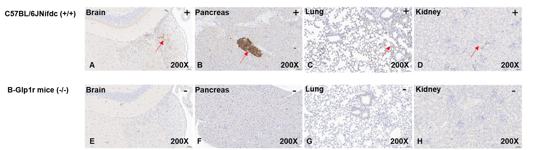 Representative mouse GLP1R expression in the different tissues of B-Glp1r KO mice by IHC. Tissues were stained with mouse-specific antibodies GLP1R (abcam: ab218532) (A-H). The brain, pancreas, lung, and kidney of wild-type C57BL/6JNifdc mice (+/+) showed mouse GLP1R positive (A-D). The brain, pancreas, lung, and kidney of B-Glp1r KO mice showed mouse GLP1R negative (E-H). Original magnification ×200. Abbreviations: IHC, immunohistochemistry.