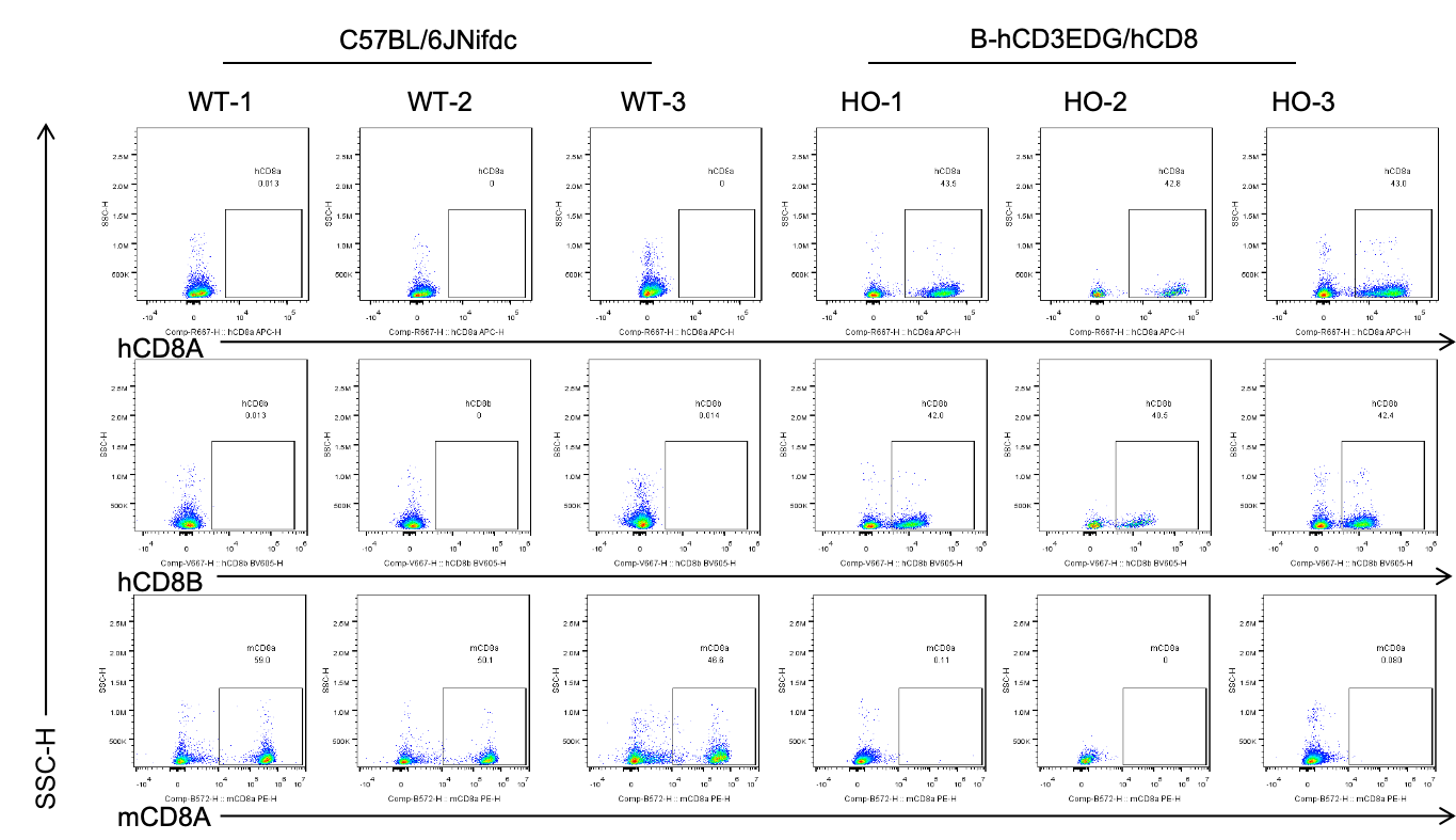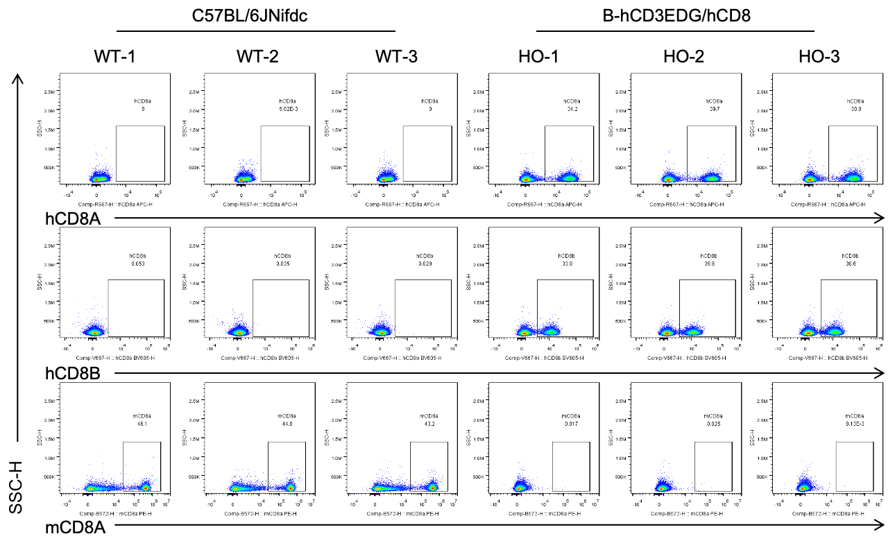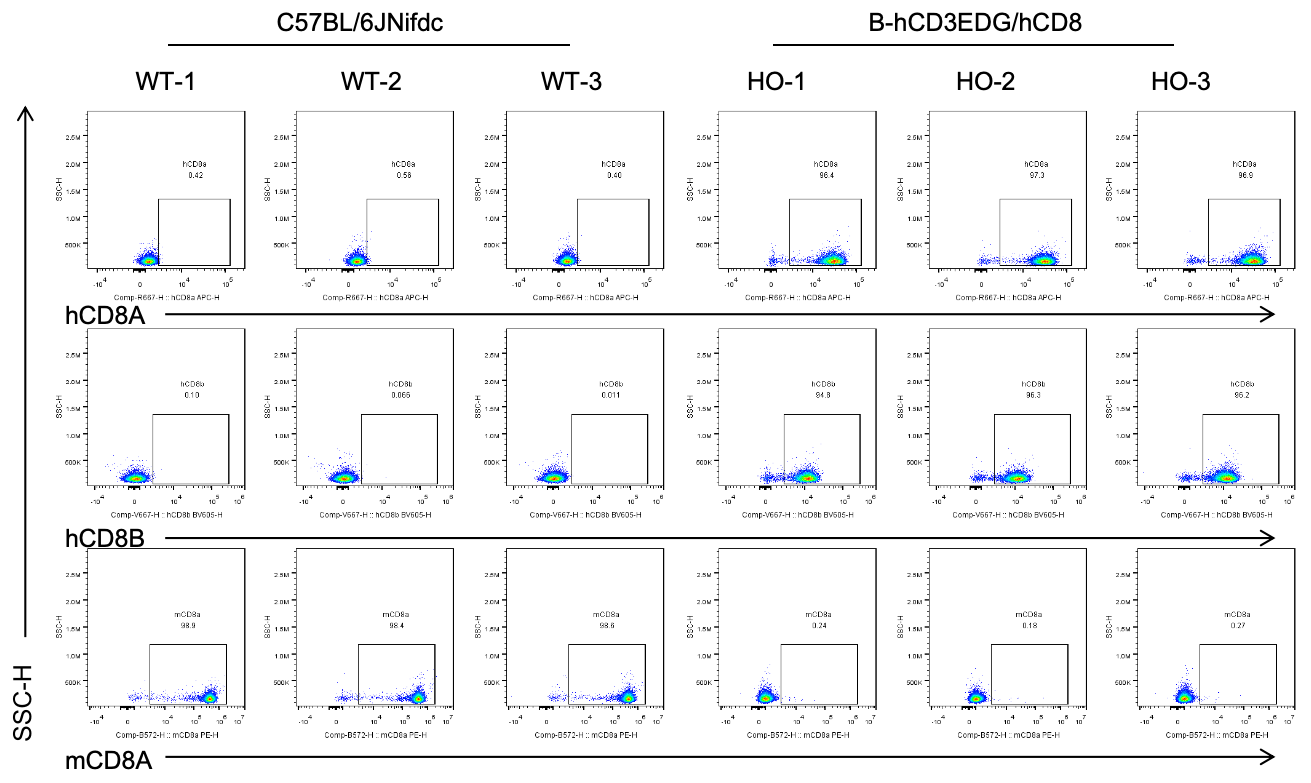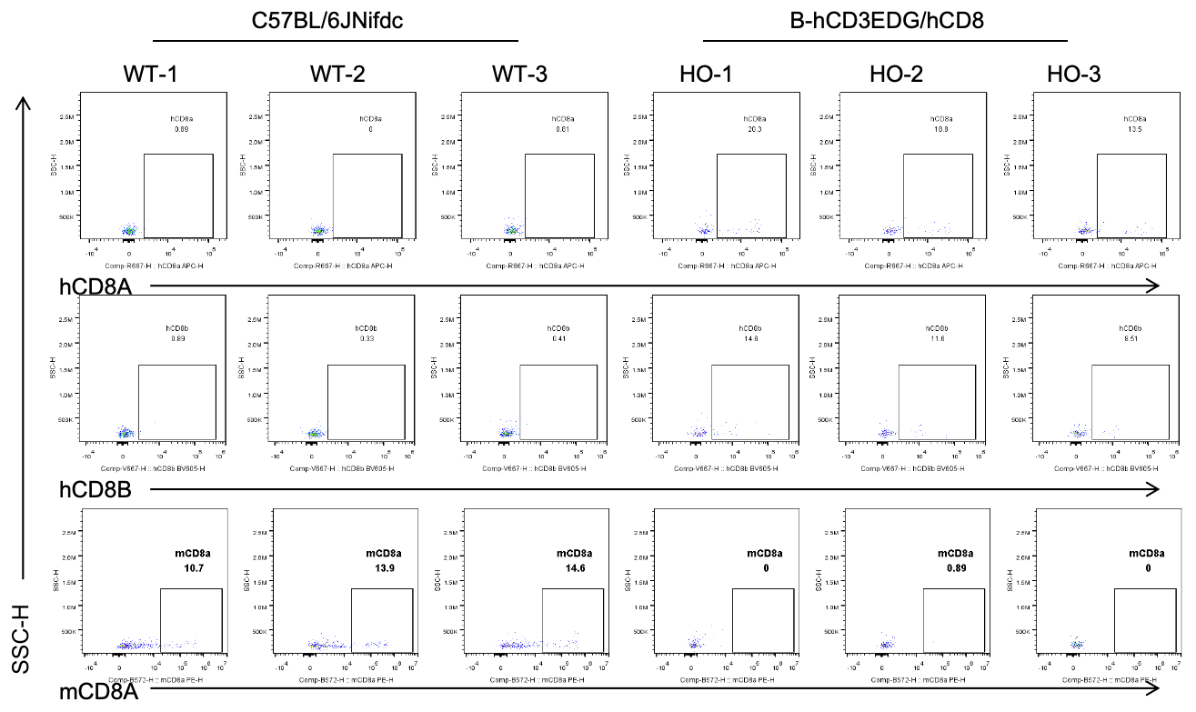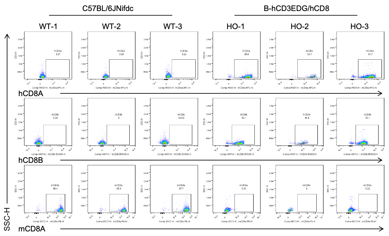Strain specific CD8 expression analysis in homozygous B-hCD3EDG/hCD8 mice by flow cytometry. Splenocytes were collected from wild-type C57BL/6JNifdc mice (WT) and homozygous B-hCD3EDG/hCD8 mice (HO), and analyzed by flow cytometry with species-specific anti-CD8 antibody (anti-human CD8A, Biolegend, 300908; anti-mouse CD8A, Biolegend, 100708; anti-human CD8B, BD, 742392). Mouse CD8A was detectable in spleen NKT cells of wild-type mice, but not in the B-hCD3EDG/hCD8 mice. Human CD8A and CD8B were exclusively detectable in spleen NKT cells of B-hCD3EDG/hCD8 mice.