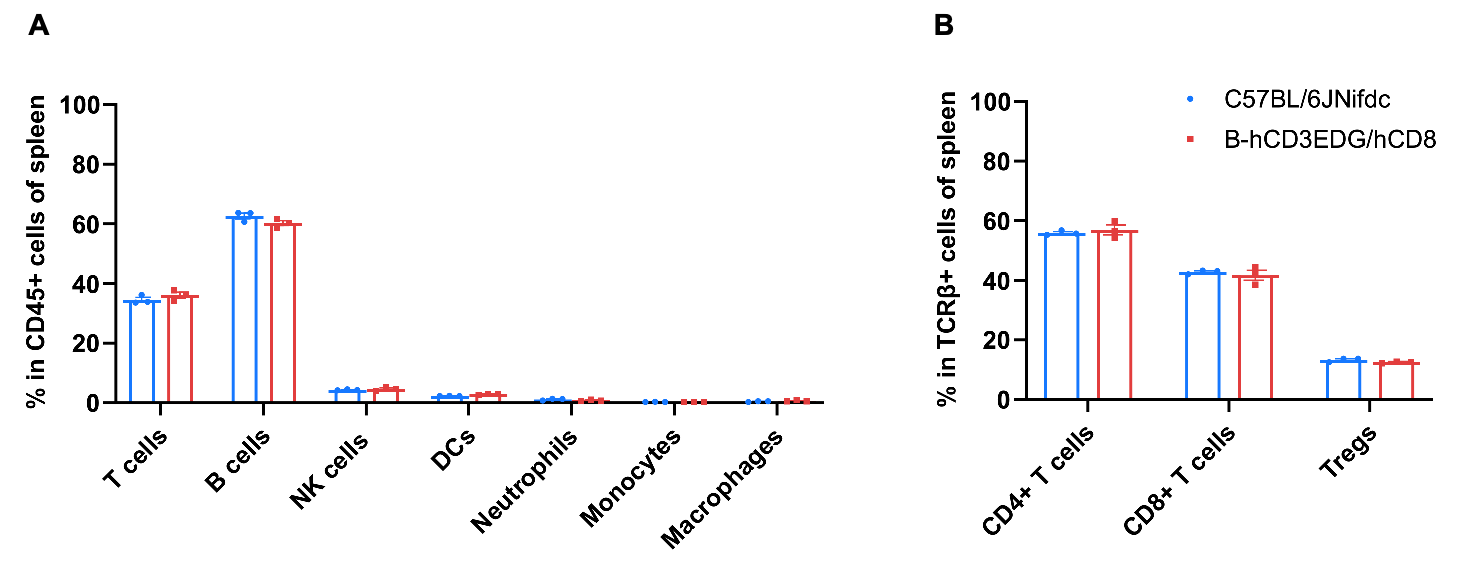 Frequency of leukocyte subpopulations in spleen by flow cytometry. Splenocytes were collected from wild-type C57BL/6JNifdc mice (male, n=3, 9-week-old), homozygous B-hCD3EDG/hCD8 mice (male, n=3, 9-week-old). A. Flow cytometry analysis of the splenocytes was performed to assess the frequency of leukocyte subpopulations. B. Frequency of T cell subpopulations. Frequency of T cells, B cells, NK cells, dendritic cells, neutrophils, monocytes, macrophages, CD4+ T cells, CD8+ T cells and Tregs in B-hCD3EDG/hCD8 mice were similar to those in C57BL/6JNifdc, demonstrating that humanization of CD3E, CD3D,CD3G and CD8 does not change the frequency or distribution of these cell types in spleen. The frequency of leukocyte subpopulations in blood, lymph nodes and thymus of B-hCD3EDG/hCD8 mice were also comparable to wild-type C57BL/6 mice (Data not shown).Values are expressed as mean ± SEM. Significance was determined by two-way ANOVA test.
