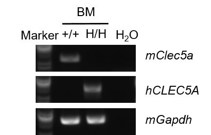 Strain specific analysis of CLEC5A mRNA expression in wild-type C57BL/6JNifdc mice and homozygous B-hCLEC5A mice by RT-PCR. Myeloid cells RNA was isolated from wildtype C57BL/6JNifdc mice (+/+) and homozygous B-hCLEC5A mice (H/H), then cDNA libraries were synthesized by reverse transcription, followed by PCR with mouse or human CLEC5A primers. Mouse Clec5a mRNA were detectable in wild-type mice. Human CLEC5A mRNA was detectable only in homozygous B-hCLEC5A mice but not in wild-type mice.
