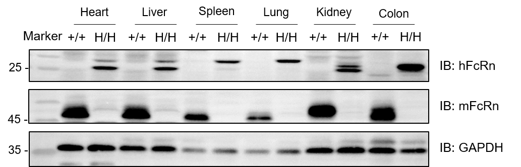 Western blot analysis of FcRn protein expression in homozygous B-hDR3/hFcRn mice. Various tissue lysates were collected from wild-type C57BL/6JNifdc mice (+/+) and homozygous B-hDR3/hFcRn mice (H/H;H/H), and then analyzed by western blot with species-specific anti-mouse FcRn antibody (R&D, AF6775) and anti-human FcRn antibody (Novus Biologicals, NBP1-89128). 40 μg total proteins were loaded for western blotting analysis. Mouse FcRn was detectable in wild-type C57BL/6JNifdc mice. Human FcRn was only detectable in homozygous B-hDR3/hFcRn mice but not in wild-type C57BL/6JNifdc mice.