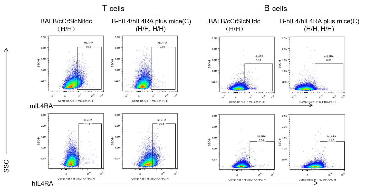Strain specific IL4RA expression analysis in wild-type BALB/cCrSlcNifdc mice and homozygous B-hIL4/hIL4RA plus mice(C) by flow cytometry. Splenocytes were collected from wild-type BALB/cCrSlcNifdc (+/+) and homozygous B-hIL4/hIL4RA plus mice(C) (H/H,H/H) stimulated with anti-CD3ε (BioXcell, BE0001) in vivo for 24 hrs, and protein expression was analyzed with anti-mouse IL4RA antibody (Biolegend, 144804) and anti-human IL4RA antibody (Biolegend, 355006) by flow cytometry. Mouse IL4RA was detectable in wild-type BALB/cCrSlcNifdc mice. Human IL4RA was detectable in homozygous B-hIL4/hIL4RA plus mice(C), but not in wild-type mice. WT: wild-type C57BL/6JNifdc mice; HO: homozygous B-hIL4/hIL4RA plus mice(C).