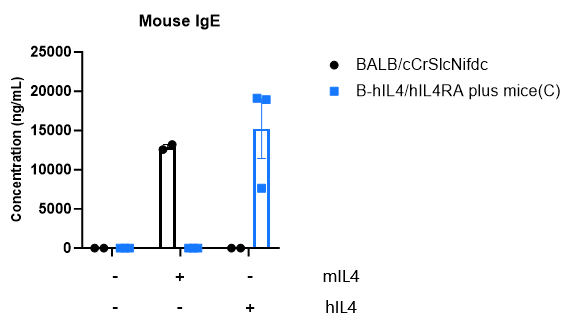 Function analysis of IL4RA in homozygous B-hIL4/hIL4RA plus mice(C). Splenocytes were collected from wild-type BALB/cCrSlcNifdc and homozygous B-hIL4/hIL4RA plus mice(C). Splenic B cells were separated via Pan B Cell Isolation Kit (Miltenyi, 130-104-443) and then cultured in 96-well plates stimulated with mCD40L, hIL4 (Sino Biological, GMP-11846-HNAE) or mIL4 (Miltenyi, 130-097-760) for 6 days. Then cell culture supernatants were collected for ELISA analysis of mouse IgE by kit (BioLegend, 432404). Mouse IgE was exclusively induced in wild-type BALB/cCrSlcNifdc mice stimulated with mIL4 and homozygous mice stimulated with hIL4, indicating that hIL4RA functions well in homozygous mice.
