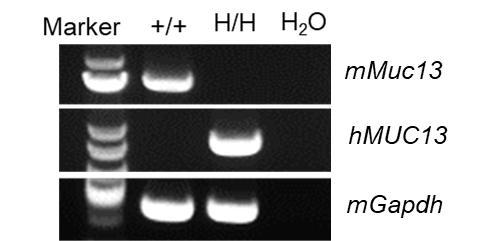 Strain specific analysis of MUC13 mRNA expression in wild-type C57BL/6 mice and B-hMUC13 mice by RT-PCR. Colon RNA were isolated from wild-type C57BL/6 mice (+/+) and homozygous B-hMUC13 mice (H/H), then cDNA libraries were synthesized by reverse transcription, followed by PCR with mouse or human MUC13 primers. Mouse Muc13 mRNA was only detectable in wild-type mice. Human MUC13 mRNA was exclusively detectable in homozygous B-hMUC13 mice but not in wild-type mice.