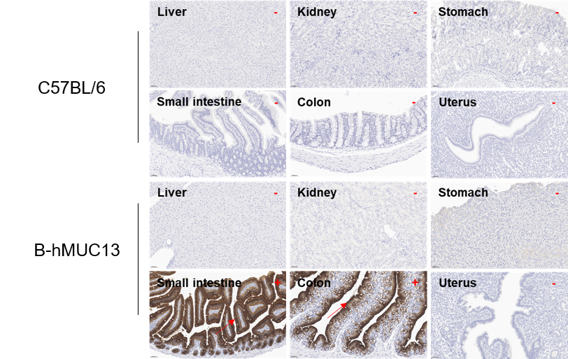 Immunohistochemical (IHC) analysis was performed to evaluate MUC13 protein expression in wild-type (WT) and B-hMUC13 mice. Tissues from six major organs were collected from WT and homozygous B-hMUC13 mice (1 female, 7 weeks old) and analyzed by IHC using anti-human MUC13 antibody (Cellsignal, 44454S). Human MUC13 expression was detected in the small intestine and colon of homozygous B-hMUC13 mice. The antibody was species-specific and did not bind to mouse MUC13 in WT mice. The results demonstrated that the MUC13 expression profile in B-hMUC13 mice closely resembles that in normal human tissues (Table 1).