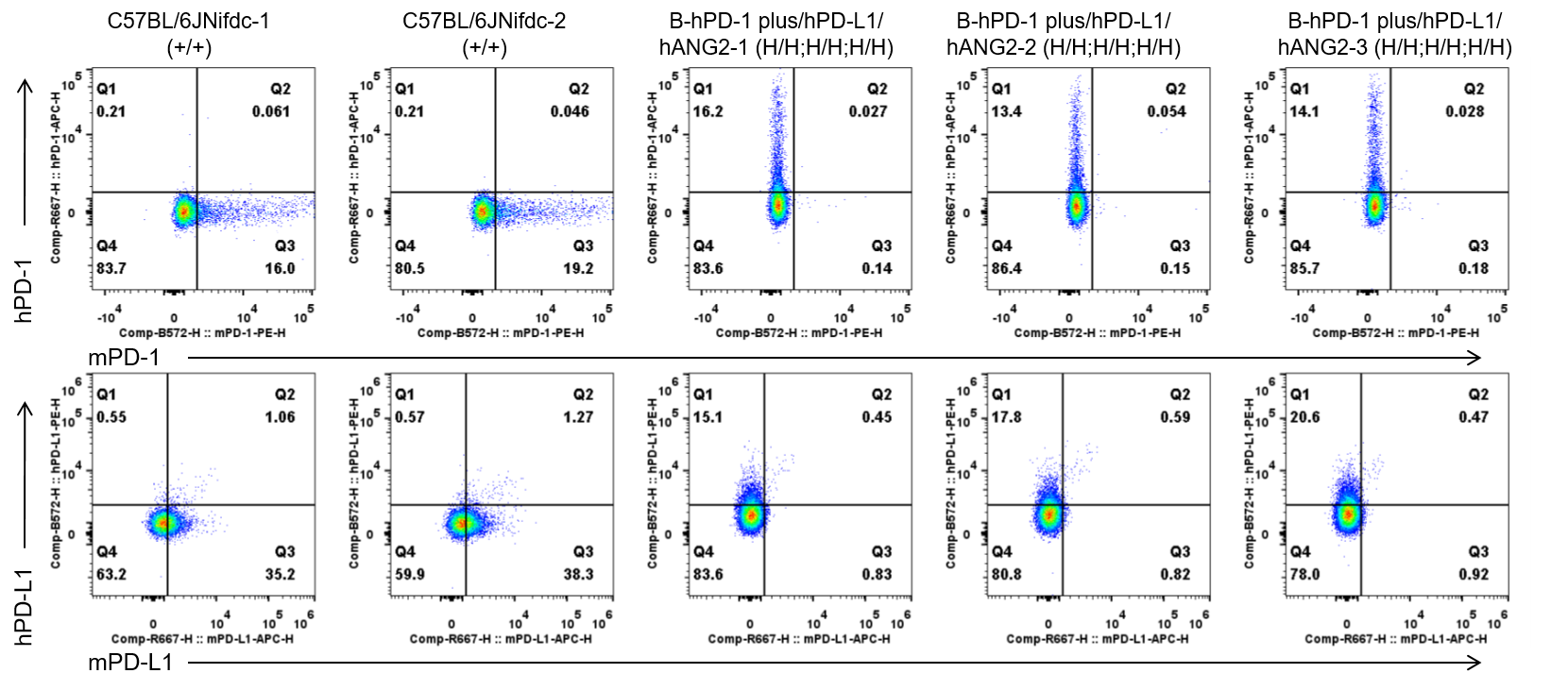 Strain specific PD-1 and PD-L1 expression analysis in homozygous B-hPD-1 plus/hPD-L1/hANG2 mice by flow cytometry. Splenocytes were collected from wild-type C57BL/6 mice (+/+) and homozygous B-hPD-1 plus/hPD-L1/hANG2 mice (H/H;H/H;H/H), and analyzed by flow cytometry with species-specific anti-mouse PD-1 antibody (Biolegend,109104), anti-human PD-1 antibody (Biolegend,329908), anti-mouse PD-L1 antibody (Biolegend,124312) and anti-human PD-L1 antibody (Biolegend,329706). Mouse PD-1 and PD-L1 were detectable in wild-type mice. Human PD-1 and PD-L1 were exclusively detectable in homozygous B-hPD-1 plus/hPD-L1/hANG2 mice but not in wild-type mice.