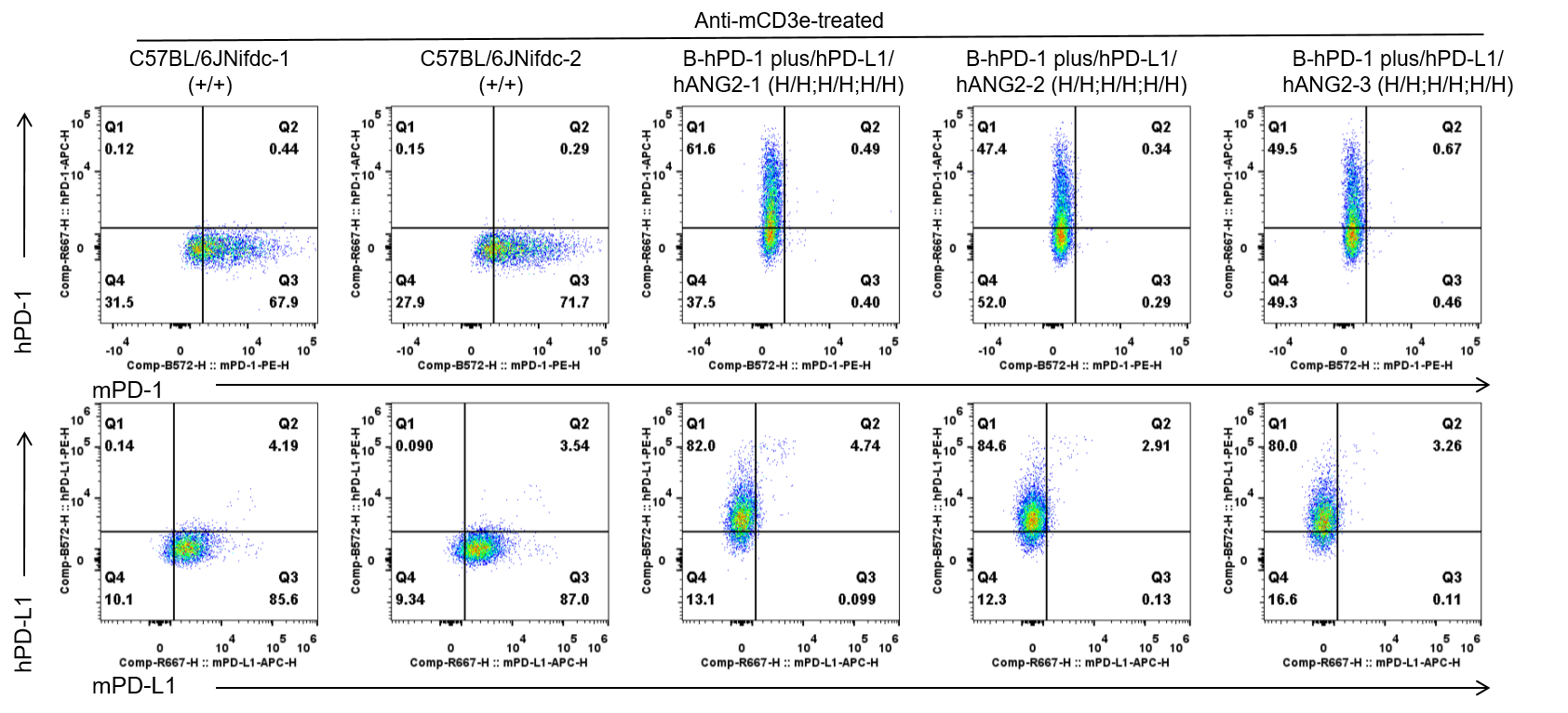 Strain specific PD-1 and PD-L1 expression analysis in homozygous B-hPD-1 plus/hPD-L1/hANG2 mice by flow cytometry. Splenocytes were collected from wild-type C57BL/6 mice (+/+) and homozygous B-hPD-1 plus/hPD-L1/hANG2 mice (H/H;H/H;H/H) stimulated with anti-CD3ε in vivo (7.5 μg/mice, stimulation for 24 hours, i.p.), and analyzed by flow cytometry with species-specific anti-mouse PD-1 antibody (Biolegend,109104), anti-human PD-1 antibody (Biolegend,329908), anti-mouse PD-L1 antibody (Biolegend,124312) and anti-human PD-L1 antibody (Biolegend,329706). Mouse PD-1 and PD-L1 were detectable in wild-type mice. Human PD-1 and PD-L1 were exclusively detectable in homozygous B-hPD-1 plus/hPD-L1/hANG2 mice but not in wild-type mice.