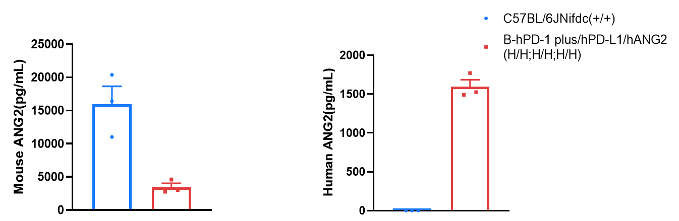 Strain specific ANG2 expression analysis in wild-type C57BL/6JNifdc mice and homozygous B-hPD-1 plus/hPD-L1/hANG2 mice by ELISA. Plasma was collected from wild-type C57BL/6JNifdc mice (+/+) (female, n=3, 9-week-old) and homozygous B-hPD-1 plus/hPD-L1/hANG2 mice (H/H;H/H;H/H) (female, n=3, 9-week-old), and expression level of mouse and human ANG2 were analyzed by ELISA (anti-mouse ANG2 ELISA kit: abcam, ab209883; anti-human ANG2 ELISA kit: R&D, DANG20). Mouse ANG2 was detectable in wild-type C57BL/6 mice and homozygous B-hPD-1 plus/hPD-L1/hANG2 mice as the ELISA kit weakly recognizes human ANG2. Human ANG2 was exclusively detectable in homozygous B-hPD-1 plus/hPD-L1/hANG2 mice. Values are expressed as mean ± SEM.