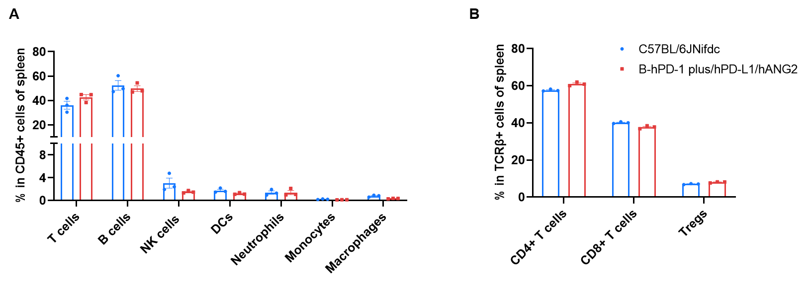 Frequency of leukocyte subpopulations in spleen by flow cytometry. Splenocytes were isolated from wild-type C57BL/6JNifdc mice (female, n=3, 9-week-old), homozygous B-hPD-1 plus/hPD-L1/hANG2 mice (female, n=3, 9-week-old). A. Flow cytometry analysis of the splenocytes was performed to assess the frequency of leukocyte subpopulations. B. Frequency of T cell subpopulations. Frequencies of T cells, B cells, NK cells, dendritic cells, neutrophils, monocytes, macrophages, CD4+ T cells, CD8+ T cells and Tregs in B-hPD-1 plus/hPD-L1/hANG2 mice were similar to those in C57BL/6JNifdc. The frequency of leukocyte subpopulations in blood and lympy nodes of B-hPD-1 plus/hPD-L1/hANG2 mice were also comparable to wild-type C57BL/6JNifdc mice (Data not shown). Values are expressed as mean ± SEM.