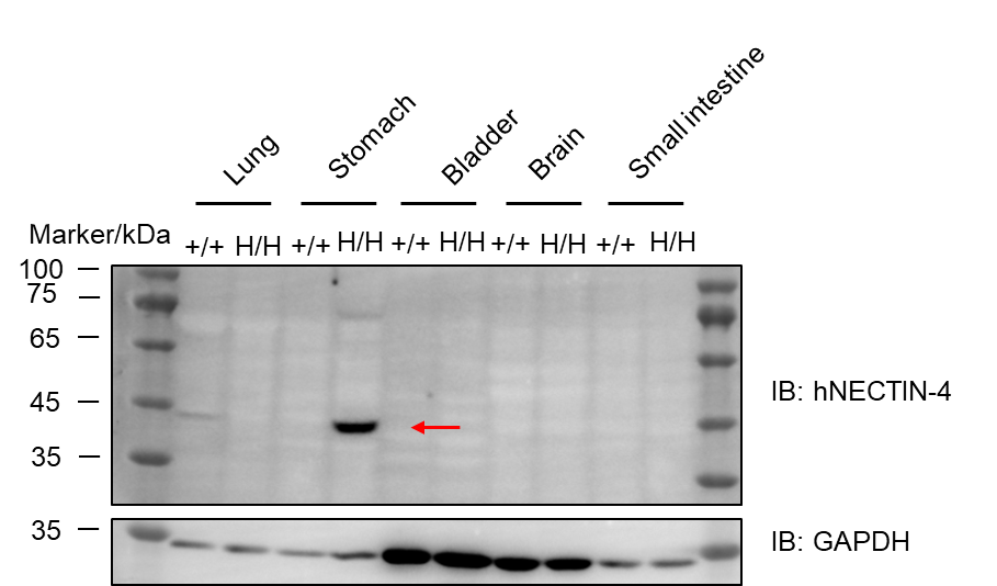 Strain specific NECTIN4 expression analysis in wild-type B-NDG mice (+/+) and homozygous humanized B-NDG hNECTIN4 mice (H/H) by western blot. The tissues of lung, stomach, bladder, brain and small intestine were collected from wild-type B-NDG mice and homozygous B-NDG hNECTIN4 mice (female, 10-week-old, n=1). Protein expression was analyzed with anti human NECTIN4 antibody (abcam, ab192033) by western blot. Human NECTIN4 was only detectable in stomach of B-NDG hNECTIN4 mice, but not in wild-type B-NDG mice.