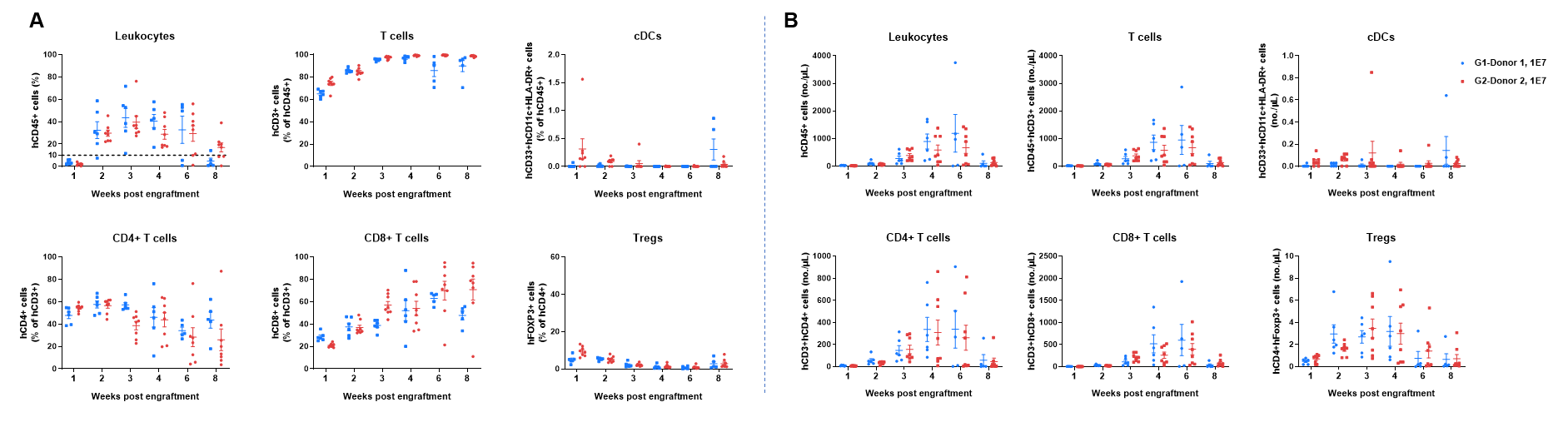 Human PBMCs were successfully reconstituted in B-NDG MHC I/II DKO mice ad. B-NDG MHC I/II DKO mice ad were engrafted intravenously with human PBMCs (1×107) from two donors on day 0 (n=6/8). Peripheral blood was taken to analyze the reconstitution level of human immune cells. A. Frequency of reconstituted human immune cells; B. Absolute cell number of reconstituted human immune cells. The results showed that two weeks after the reconstitution of human PBMCs in B-NDG MHC I/II DKO mice ad, the frequency and absolute cell number of CD45+ cells in peripheral blood began to increase. The frequency of reconstituted human T cells exceeded 90% from three weeks and continued to rise, eventually reaching nearly 100%. Reconstituted human T cells include CD4+T cells, CD8+T cells and Tregs. A small amount of DCs can also be detected. This indicates that B-NDG MHC I/II DKO mice ad is a powerful immunodeficient mouse model for reconstitution of the human T cells using human PBMCs.