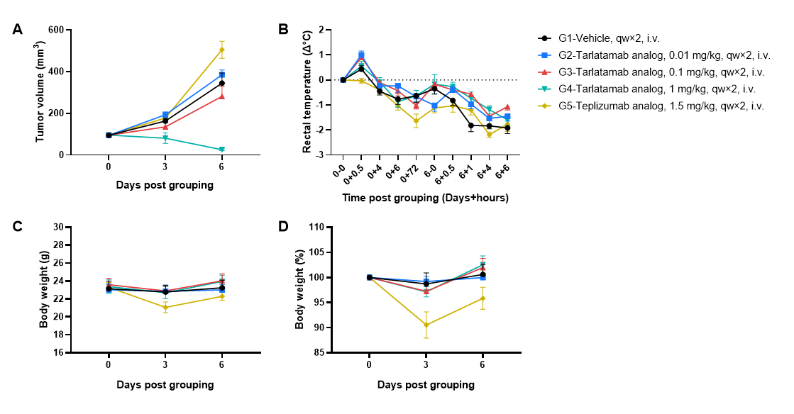 Antitumor activity and toxicity of anti-human CD3/DLL3 bispecific T-cell engager-tarlatamab analog (in-house) in small cell lung cancer cell line SHP-77 CDX model established with huPBMC-B-NDG MHC I/II DKO mice ad . Human PBMCs (1×107) were intravenously engrafted into B-NDG MHC I/II DKO mice ad. Seven days later, SHP-77 cells (5×106) were subcutaneously inoculated into huPBMC-B-NDG MHC I/II DKO mice ad. Mice were grouped when the tumor volume reached approximately 100 mm3, and the frequency of hCD45+ cells ≥10%, at which time they were treated intravenously with tarlatamab analog and teplizumab analog as positive control for CRS (Cytokine Release Syndrome). The doses and schedule were indicated in panel (female, 8-week-old, n=6). (A) Tarlatamab analog could effectively inhibit tumor growth in a dose-dependent manner in huPBMC-B-NDG MHC I/II DKO mice ad, whereas teplizumab analog showed no tumor antigen–dependent antitumor activity. (B–D) Teplizumab analog induced pronounced body weight loss and hypothermia, while tarlatamab analog caused only mild body weight changes with measurable but less severe decreases in rectal temperature. Values are expressed as mean ± SEM.