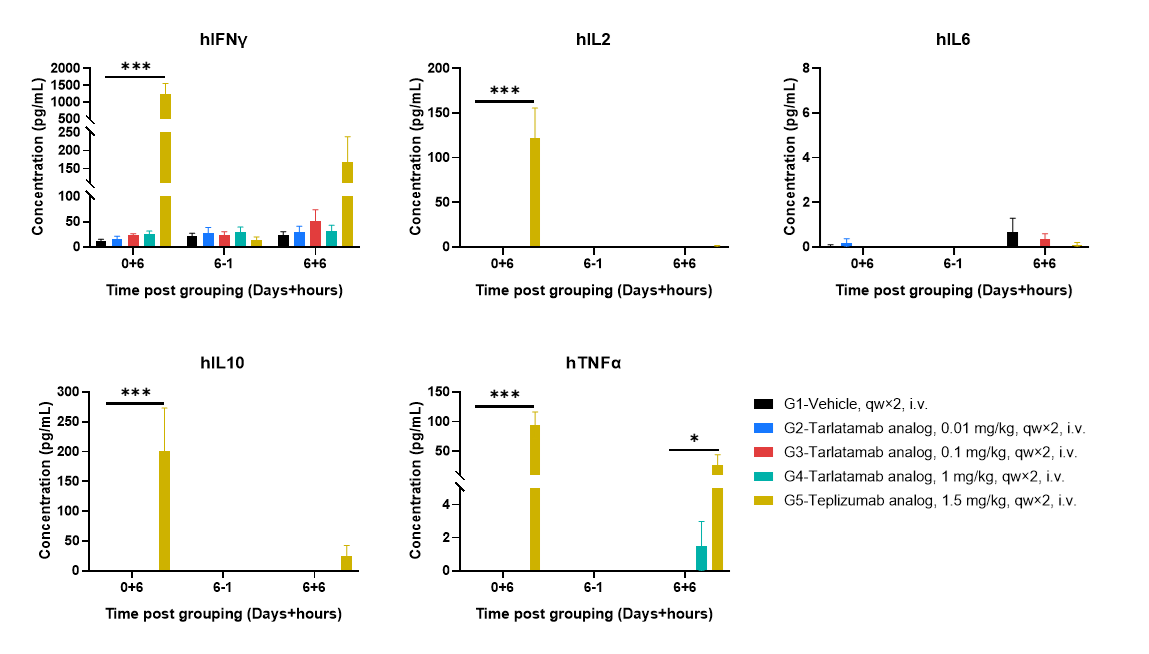 Plasma cytokine releases following first and repeat dosing in huPBMC-B-NDG MHC I/II DKO mice ad. Plasma cytokine levels were assessed at defined time points following dosing, including 6 hours after the first administration (0+6), one day prior to the second administration on day 6 (6−1), and 6 hours after the second administration (6+6). Cytokine concentrations were higher following the first administration than after the second administration, indicating a more pronounced cytokine response after initial dosing. Teplizumab analog-treated mice exhibited elevated cytokine levels, whereas cytokine levels in tarlatamab analog-treated groups were low or below the detection range at the indicated time points. The undetectable values may be attributable to high plasma dilution during sample preparation, and assay sensitivity will be further optimized by reducing dilution factors in subsequent studies. Values are expressed as mean ± SEM. Significance was determined by two-way ANOVA test. *P < 0.05, **P < 0.01, ***P < 0.001.
