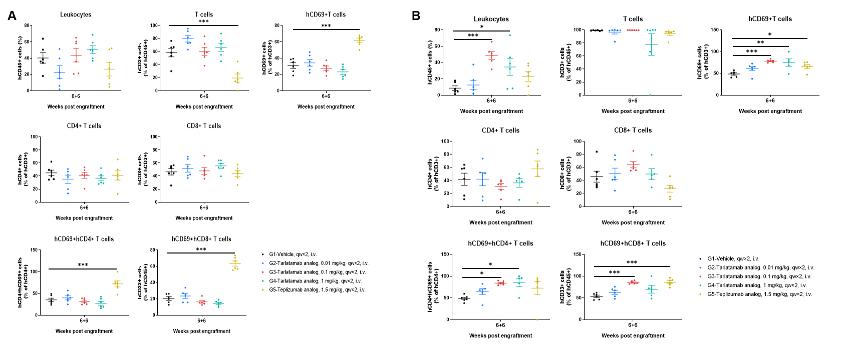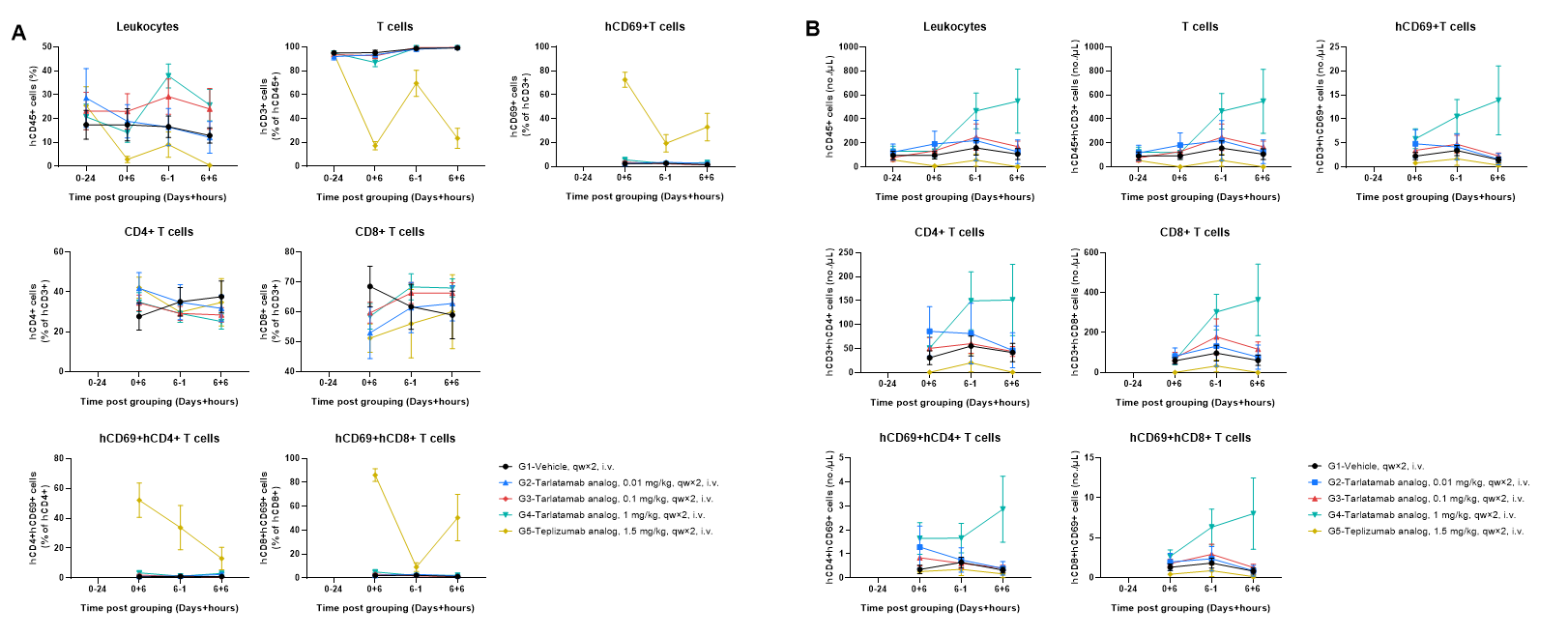 Human PBMCs were successfully reconstituted in B-NDG MHC I/II DKO mice ad. Peripheral blood was collected at the indicated time points. (A) The frequencies of reconstituted immune cells; (B) The absolute number of reconstituted immune cells. In vehicle- and tarlatamab analog–treated groups, the frequencies of CD3+ T cells remained high with relatively stable CD4/CD8 composition, while the 1 mg/kg tarlatamab analog group exhibited a clear increase in circulating human CD45+ leukocytes and CD3+ T cell counts after dosing, accompanied by a modest increase in CD69+ T cells. In contrast, the teplizumab analog (positive control for CRS) induced rapid and pronounced CD69 upregulation on both CD4+ and CD8+ T cells, together with an overall reduction in circulating human leukocyte/T cell frequency and absolute numbers compared with other groups. Values are expressed as mean ± SEM.
