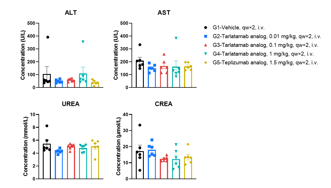 No apparent acute hepatic or renal toxicity signals at 6 h after the second administration. Serum was collected 6 h after the second intravenous administration and clinical chemistry parameters were measured, including ALT and AST (liver enzymes) as well as urea and creatinine (renal function markers). Values are expressed as mean ± SEM. Significance was determined by one-way ANOVA test. *P < 0.05, **P < 0.01, ***P < 0.001.