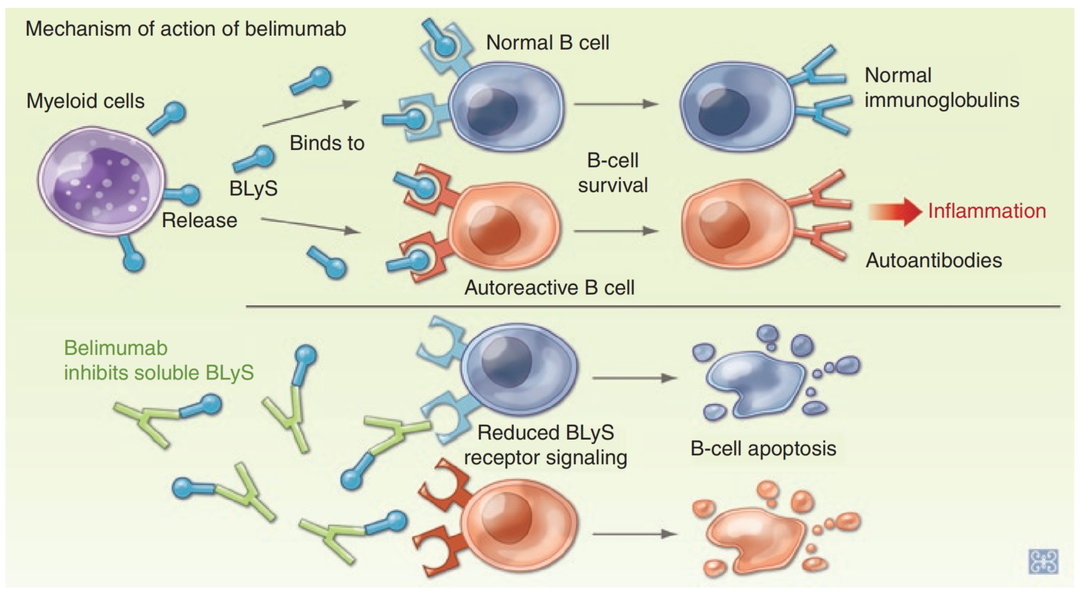 贝利尤单抗(Belimumab,商品名:倍力腾)是一种特异性识别和抑制BAFF生物活性的人源性单克隆抗体,能显著降低循环B细胞水平。