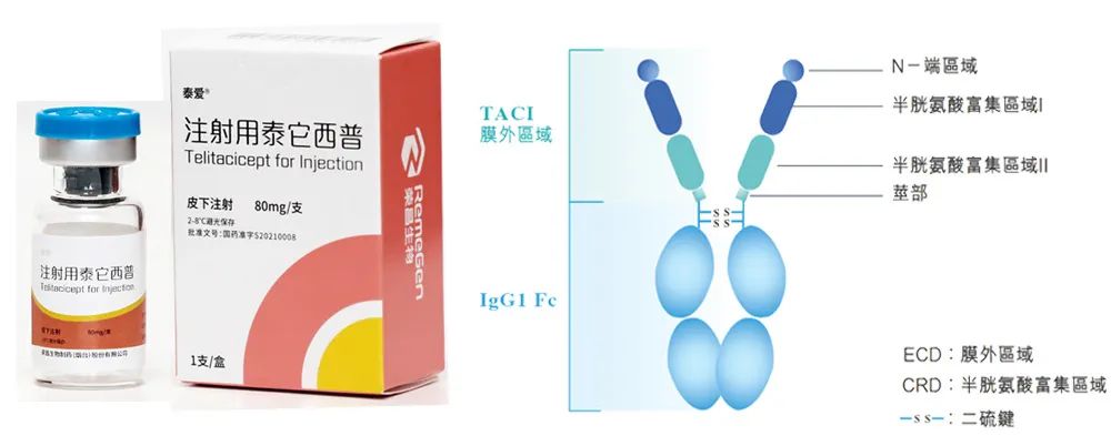 泰它西普(Telitacicept,商品名:泰爱)是一种TACI-Fc融合蛋白,由人跨膜激活剂及钙调亲环素配体相互作用因子(TACI)受体的胞外域以及人免疫球蛋白G(IgG)的可结晶片段(Fc)域构成。