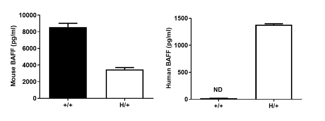 用ELISA方法对野生型(WT)小鼠和B-hBAFF小鼠进行BAFF种特异性表达分析。采集WT小鼠(+/+)和杂合子B-hBAFF小鼠(H/+)的血清,用种特异性BAFF ELISA试剂盒进行ELISA分析。小鼠BAFF在WT小鼠和杂合B-hBAFF小鼠中均可检测到,人BAFF在杂合B-hBAFF小鼠中可检测到。