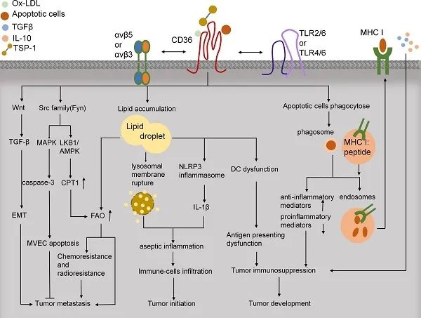 CD36在肿瘤微环境中发挥作用。CD36调节下游Src家族激酶促进抗血管生成、FAO以及化疗耐药和放疗耐药,从而导致肿瘤转移。CD36还通过EMT激活Wnt/TGF-β信号传导促进肿瘤转移。CD36摄取多种脂质,如ox-LDL、LCFAs和胆固醇。免疫细胞中的脂质沉积导致树突状细胞的无菌性炎症和抗原呈递功能障碍,从而诱导肿瘤免疫抑制。此外,CD36可以与凋亡细胞结合并激活交叉引物,这可能导致免疫抑制和肿瘤发展。
