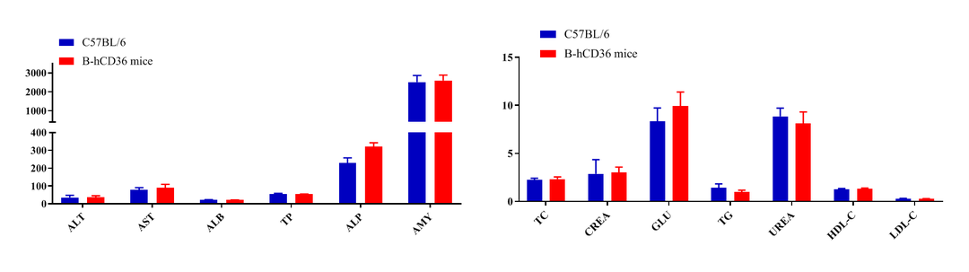 B-hCD36小鼠的血生化试验。收集C57BL/6和B-hCD36小鼠(n=8,6-8周龄)的血清,并分析其指标水平。B-hCD36小鼠的测量结果与C57BL/6小鼠相似,表明人源化不会改变肝脏等相关组织的健康。数值表示为平均值±SEM。
