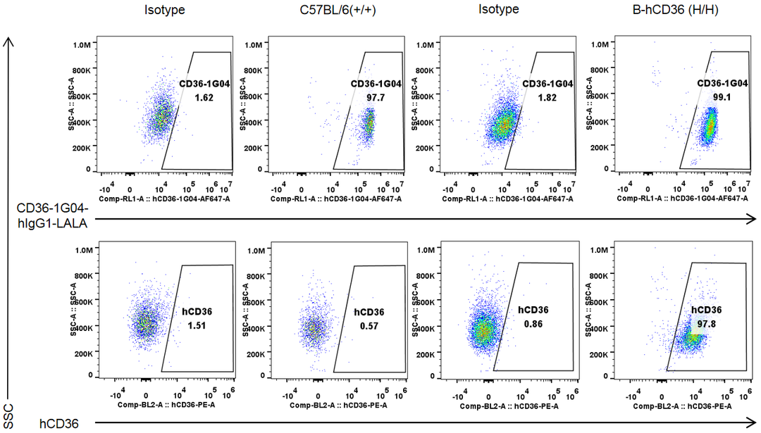 通过流式细胞术对纯合B-hCD36小鼠进行种属特异性CD36表达分析。收集野生型小鼠 (+/+)和纯合B-hCD36小鼠(H/H)的腹腔渗出巨噬细胞,并通过抗CD36抗体的流式细胞术进行分析。人CD36仅在纯合B-hCD36小鼠中可检测到,但在野生型小鼠中未检测到。CD36-1G04-hIgG1-LALA抗体在小鼠和人中交叉识别。