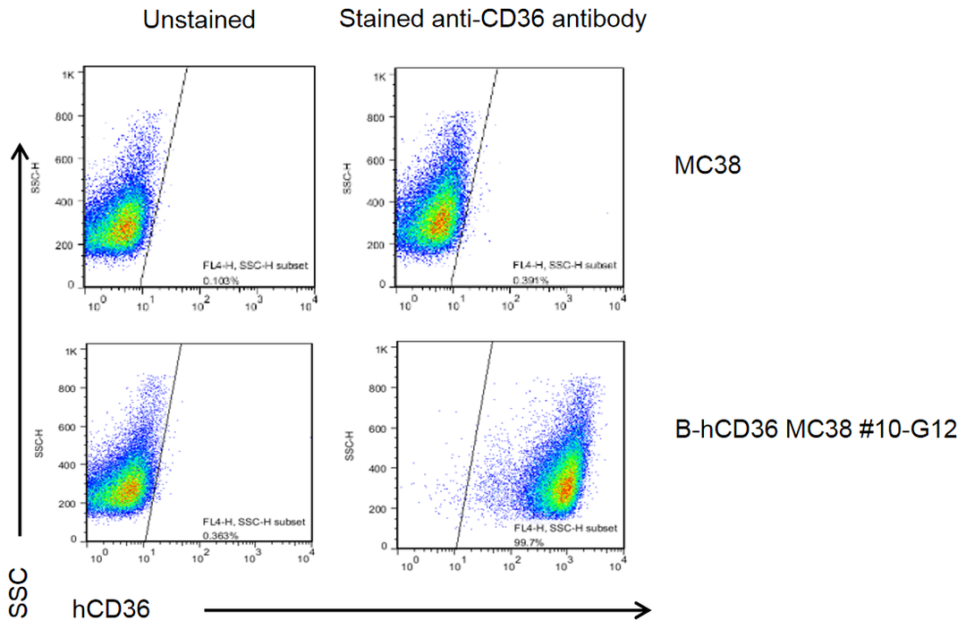 通过流式细胞术对B-hCD36 MC38细胞中的CD36表达进行分析。用种属特异性抗 CD36抗体对B-hCD36 MC38培养物的单细胞混悬液进行染色。在B-hCD36 MC38细胞表面检测到人CD36,但在野生型MC38细胞表面未检测到。使用B-hCD36 MC38细胞的10-G12克隆进行体内实验。