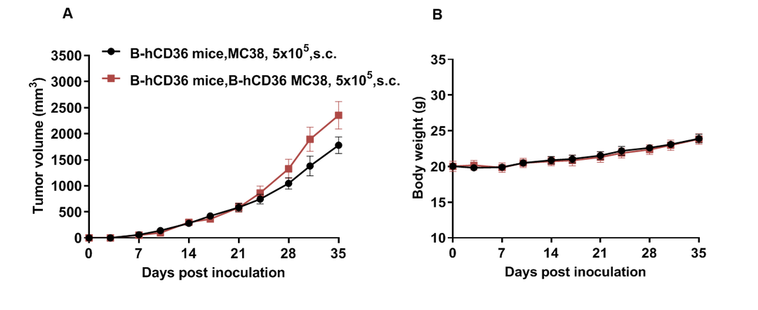 B-hCD36 MC38细胞的皮下同种移植肿瘤生长。将B-hCD36 MC38细胞(5x105)和野生型MC38细胞(5x105)皮下植入B-hCD36小鼠(雌性,7周龄,n=5)。每周测量两次肿瘤体积和体重。(A)平均肿瘤体积±SEM。(B)体重(平均值±SEM)。体积以mm3表示,使用公式:V=0.5X长径X短径2。如图A所示,B-hCD36 MC38细胞能够在体内建立肿瘤,可用于有效性研究。