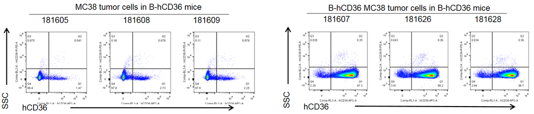 将B-hCD36 MC38细胞皮下移植到B-hCD36小鼠(n=5)中,接种后35天,收获肿瘤细胞并通过流式细胞术评估人CD36表达。如图所示,人CD36在肿瘤细胞表面高度表达。因此,B-hCD36 MC38细胞可用于新型CD36疗法的体内药效研究。