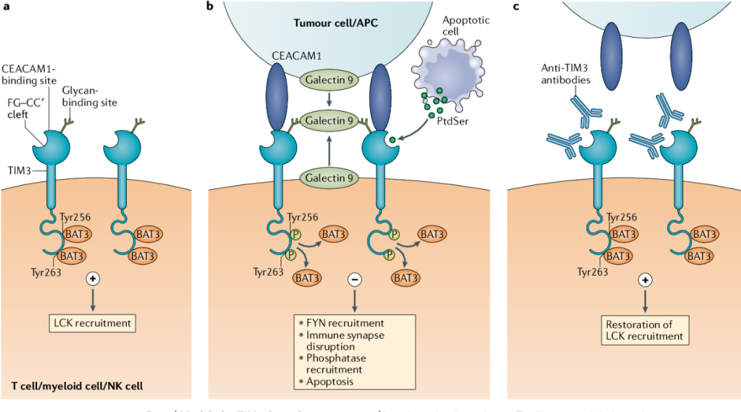 当TIM3未与其配体结合时,它被招募到T细胞激活的免疫突触中,与 HLA-B相关转录产物3(BAT3)相互作用,并通过酪氨酸激酶LCK募集维持T细胞活化。可溶性凝集素半乳糖凝集素9(Galectin 9)和粘附分子癌生物抗原相关细胞粘附分子1(CEACAM1),通过酪氨酸激酶ITK触发Tyr256和Tyr263的磷酸化。磷酸化后,BAT3从TIM3中释放出来,从而使TIM3发挥其抑制功能。BAT3敲除的T细胞其共抑制受体的表达升高,并且在自身免疫的背景下表现出降低的致病性,说明BAT3通过负反馈来调节T细胞的功能。FYN与BAT3结合TIM3的同一区域。多数促进抗肿瘤免疫的TIM3靶向抗体干扰CEACAM1或PtdSer与TIM3的结合,从而维持TIM3-BAT3的相互作用[2]。