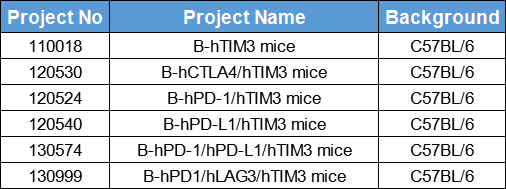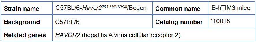 针对TIM3靶点机制研究和新药开发的需求,BioMice百奥动物自主研发了B-hTIM3 mice,同时也扩繁了B-hPD-1/hTIM3 mice,B-hPD-L1/hTIM3 mice,B-hCTLA4/hTIM3 mice双人源化小鼠及B-hPD-1/hPD-L1/hTIM3 mice等三人源化小鼠,相关模型列表见文末,助力靶向TIM3药物开发,为临床前药效评估提供了优质模型。