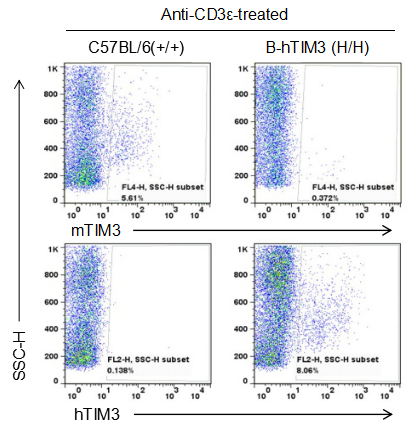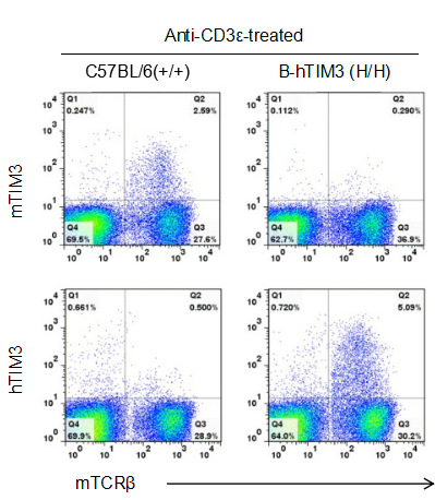 通过流式细胞术对纯合B-hTIM3 小鼠进行种属特异性 TIM3 表达分析。收集野生型C57BL/6和纯合 B-hTIM3 小鼠的脾细胞,结果显示:小鼠 TIM3 仅在野生型小鼠中检测到。人 TIM3 仅在纯合 B-hTIM3 小鼠中检测到。