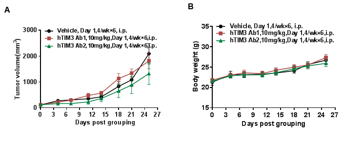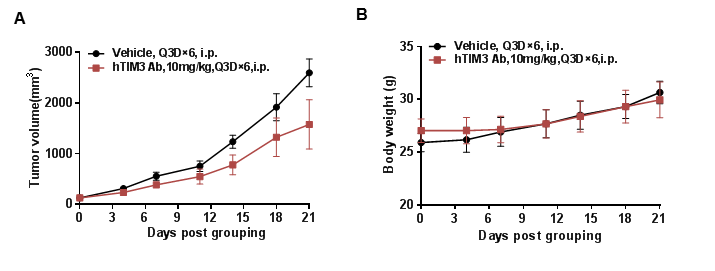 抗人 TIM3 抗体在B-hTIM3 小鼠中的抗肿瘤活性。(A)抗人 TIM3 抗体可抑制B-hTIM3 小鼠中的MC38肿瘤生长。将小鼠结肠癌MC38细胞皮下植入纯合B-hTIM3 小鼠(雌性,4周龄,n=5)。当肿瘤体积达到约100 mm3时,将小鼠分组,此时用抗人 TIM3 抗体处理。(B)给药期间体重变化。如图A所示,抗人 TIM3 抗体可有效抑制B-hTIM3 小鼠的肿瘤生长,表明B-hTIM3 小鼠为抗人 TIM3 抗体的体内评价提供了有力的临床前模型。