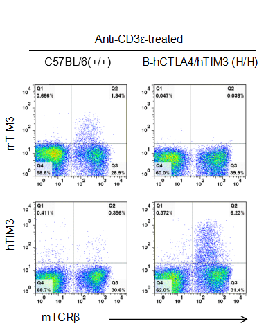 通过流式细胞术对纯合B-hCTLA4/hTIM3 小鼠进行种属特异性 TIM3 表达分析。收集野生型C57BL/6和纯合 B-hCTLA4/hTIM3(H/H) 小鼠的脾细胞,结果显示:小鼠 TIM3 在野生型小鼠中可检测到。人 TIM3 仅在纯合 B-hCTLA4/hTIM3 小鼠中可检测到,但在 WT 小鼠中未检测到。