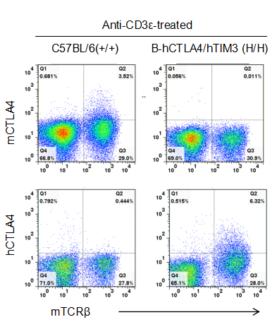 通过流式细胞术对纯合B-hCTLA4/hTIM3 小鼠进行种属特异性CTLA4 表达分析。收集野生型C57BL/6和纯合 B-hCTLA4/hTIM3(H/H) 小鼠的脾细胞,结果显示:小鼠 CTLA4 在野生型小鼠中可检测到。人CTLA4仅在纯合 B-hCTLA4/hTIM3 小鼠中可检测到,但在 WT 小鼠中未检测到。