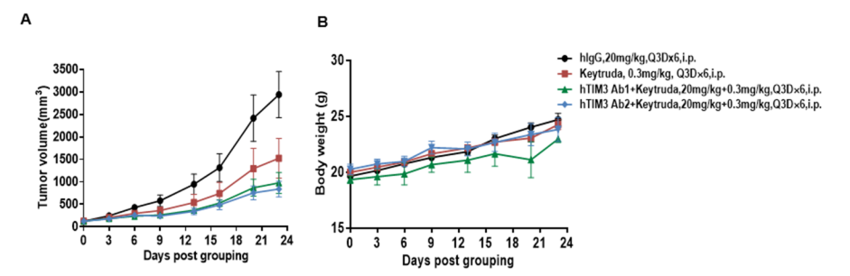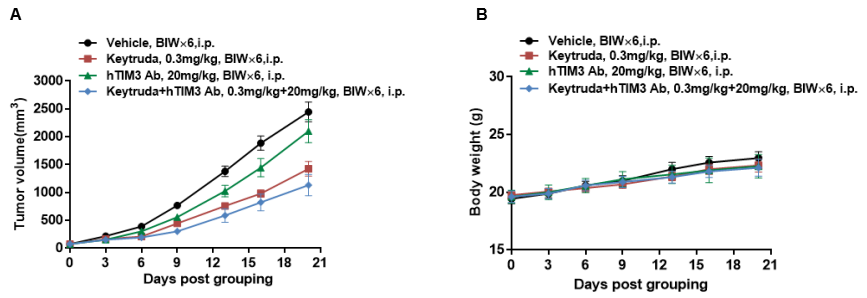 抗人TIM3抗体联合抗人PD-1抗体在B-hPD-1/hTIM3 小鼠中的抗肿瘤药效。(A)抗人TIM3 抗体联合抗人PD-1抗体抑制B-hPD-1/hTIM3 小鼠MC38肿瘤生长。小鼠结肠癌MC38细胞(5×105)皮下植入纯合B-hPD-1/hTIM3小鼠中(雌性,6-8周龄,n=6)。当肿瘤体积达到大约150±50 mm3时,小鼠被分组,然后用抗人 TIM3 抗体联合抗人PD -1抗体Keytruda给药。(B)治疗期间体重变化。如图A所示,抗人TIM3抗体与抗人PD-1抗体联合使用比单独使用组对肿瘤生长具有更强的抑制作用,说明B-hPD-1/hTIM3小鼠为评价人TIM3抗体与人PD-1抗体联合治疗的体内评估提供了一个强有力的临床前模型。