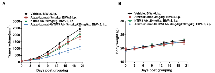 抗人PD-L1抗体(内部合成)联合抗人TIM3抗体在B-hPD-1/hPD-L1/hTIM3 小鼠中的抗肿瘤药效。(A) 纯合B-hPD-1/hPD-L1/hTIM3 小鼠(雌性,7-8周龄,n=6)皮下接种小鼠结肠癌MC38细胞。当肿瘤体积达到约100 mm3时对小鼠进行分组,分组后给抗人PD-L1抗体和抗人 TIM3 抗体进行治疗,剂量和时间表如图 A 所示。(B) 给药期间的体重变化。如图 A 所示,抗人 PD-L1 抗体和抗人 TIM3 抗体联合给药组的抑制作用强于单药组,抗人 PD-L1 抗体联合抗人 TIM3 抗体可抑制 B-hPD-1/hPD-L1/hTIM3 小鼠中的肿瘤细胞生长。结果证明 B-hPD-1/hPD-L1/hTIM3 小鼠可为体内评价抗人PD-L1 和抗人TIM3抗体药效提供有力的临床前研究模型。