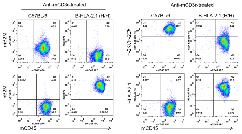 野生C57BL/6 (+/+)小鼠和纯合B-HLA-A2.1小鼠 (H/H)注射抗CD3E抗体后,取脾细胞进行流式细胞术检测。结果显示:野生C57BL/6小鼠可检测到小鼠B2M和H-2Kb/H-2Db。纯合B-HLA-A2.1小鼠中只能检测到人B2M和HLA-A2.1,检测不到小鼠B2M和H-2Kb/H-2Db。
