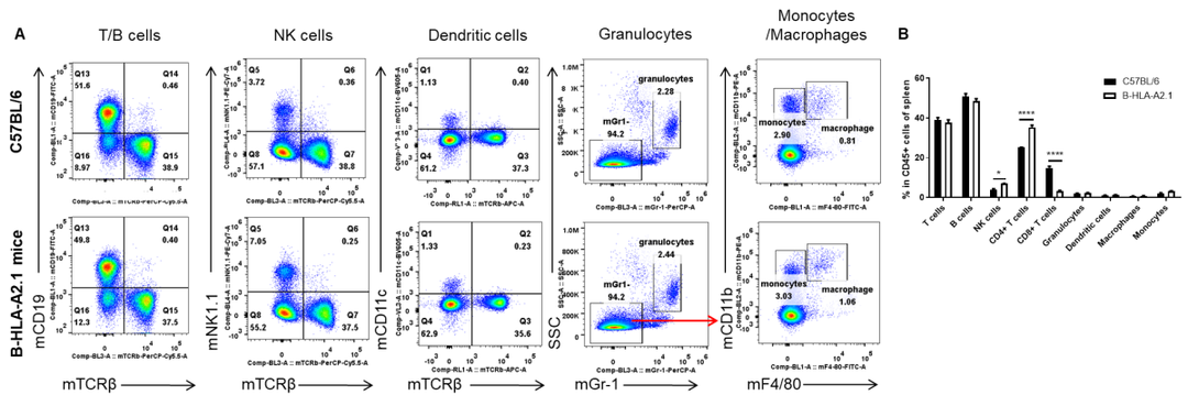 从C57BL/6小鼠和纯合B-HLA-A2.1小鼠(n= 3,8周龄,雌性)中分离脾细胞。流式细胞术分析脾细胞以评估白细胞亚群。结果表明:纯合B-HLA-A2.1小鼠的B细胞、树突状细胞、粒细胞、单核细胞和巨噬细胞的百分率与C57BL/6小鼠相似。CD8+ T细胞百分率显著降低,CD4+ T细胞百分率和NK细胞百分率显著升高,说明hB2M-HLA-A2.1-H-2D替代小鼠B2M可能影响CD8+ T细胞的发育,进而影响脾脏T细胞亚型的比例。数值用平均值±SEM表示。