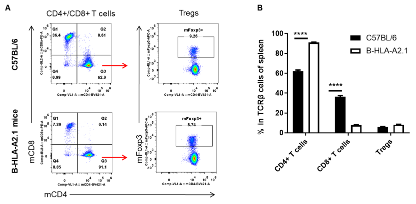 从C57BL/6和纯合B-HLA-A2.1小鼠(n= 3,8周龄,雌性)中分离脾细胞。流式细胞术分析脾细胞以评估T细胞亚群。结果表明:纯合B-HLA-A2.1小鼠中调节性T细胞的百分率与C57BL/6小鼠相似。CD8+ T细胞百分率显著降低,CD4+ T细胞百分率显著升高,说明hB2M-HLA-A2.1-H-2D替代小鼠B2M可能影响CD8+ T细胞的发育,进而影响脾脏T细胞亚型的比例。数值用平均值±SEM表示。