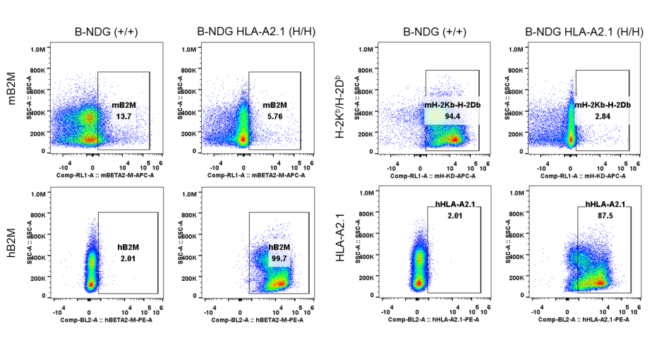 流式细胞术检测B-NDG小鼠(+/+)和纯合B-NDG HLA-A2.1小鼠(H/H)脾细胞。结果表明:小鼠B2M和H-2Kb/H-2Db在B-NDG小鼠中检测到,但在B-NDG HLA-A2.1小鼠中检测不到。人B2M和HLA-A2.1在纯合B-NDG HLA-A2.1小鼠中检测到,而在B-NDG小鼠中未检测到。